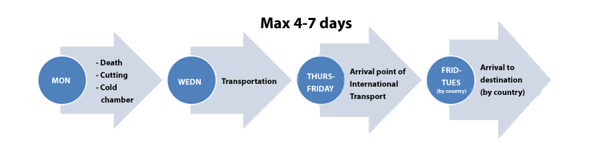 All our fresh meats are vacuum packed and have 21 days of expiration from the time of packaging. The process from death to delivery to the customer line for up to 4 / 7 days, depending on the country of the EU.